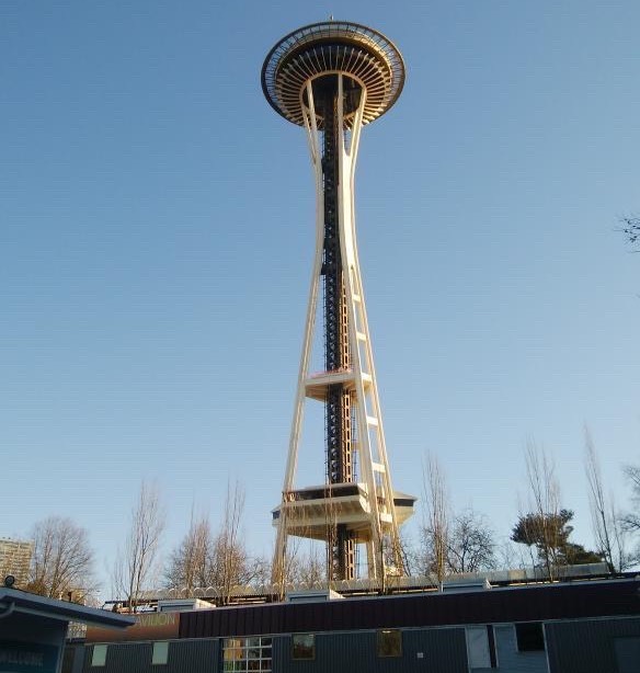 スペースニードルは高さ184mの展望台です。東京タワーほど高くはないですが、先っぽにある特徴的なニードルなど全体としておしゃれなデザインになっています。最上階に行くと、上は吹き抜け、周りはガラスで囲われていて開放感があります。円周を板のガラスで囲っているためガラス間に隙間があり、スマホくらいなら余裕で落とす可能性があります。