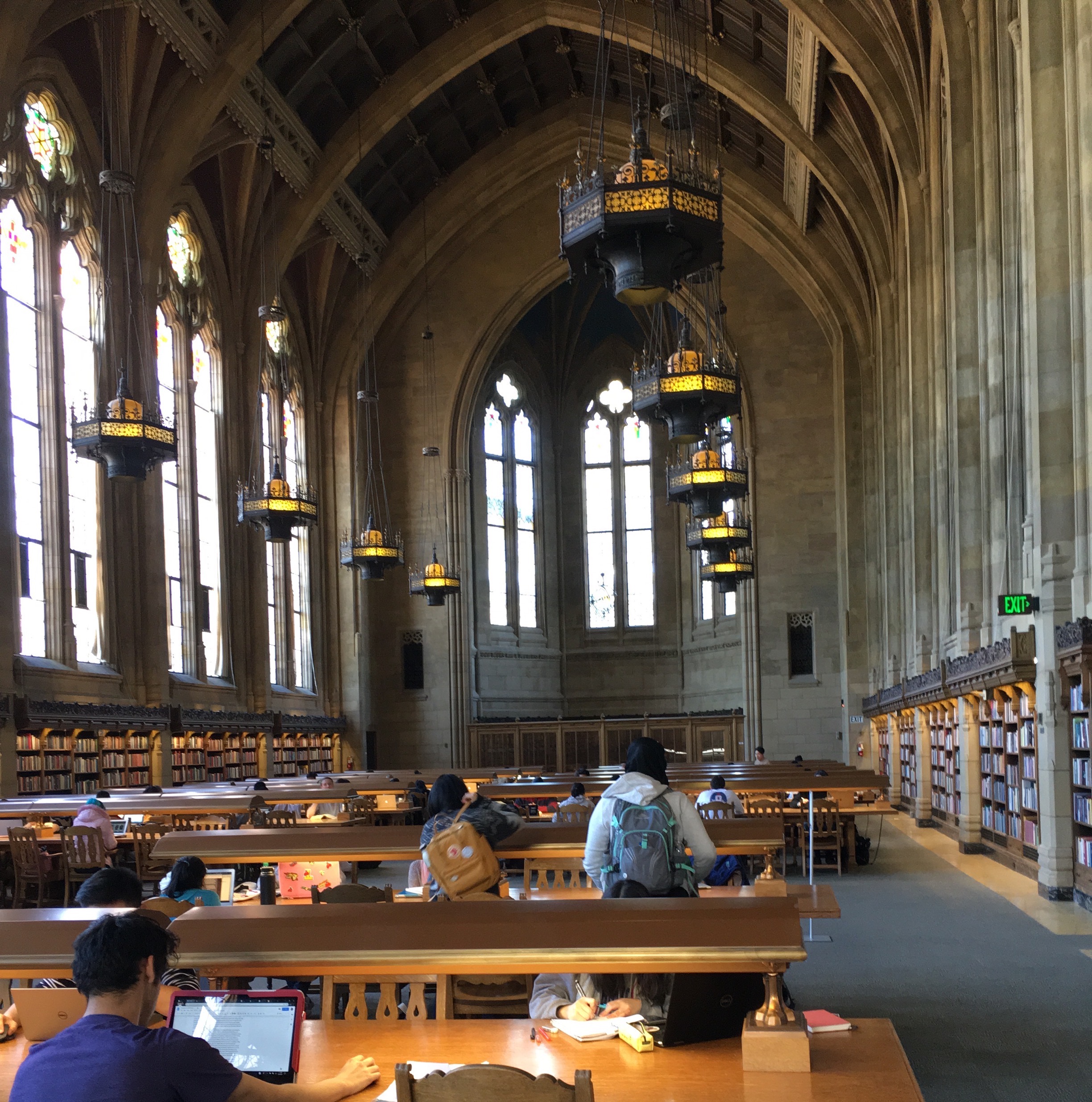 ハリー・○ッターの世界!?というのが最初の感想でした。天井も高く、かえって集中できないのではと思いましたが、座ってみるととても静かで集中力が高まる空間でした。ワシントン大学にはいろんな国からの留学生がたくさんいて、その留学生たちと図書館でちょっとした会話ができるのは魅力のうちの一つです。